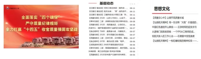 院屬各單位制作航天科工質量日電視墻,在北京各工業區和成都分中心各科研場所同步播放;組織開展質量案例分享;以匠心守初心,積極開展質量信得過班組、質量標兵等質量先進事例和人物宣傳,同時基于內部網站、宣傳欄等多種渠道進行廣泛宣傳,弘揚優秀航天質量文化。