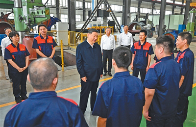 7月7日至8日,中共中央總書記、國家主席、中央軍委主席習近平在山西考察。這是7日下午,習近平在陽泉閥門股份有限公司考察時,同企業員工親切交流。新華社記者燕雁攝